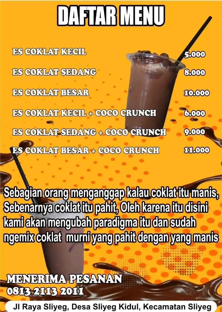 Buat Kakang, Yayu, Bapak, Semangat, Sembok, Mamang Bibi, Nang Nok, Yang suka Coklat, boleh cobain minuman Coklat Anak Wadon, Lokasinya di Sliyeg Indramayu